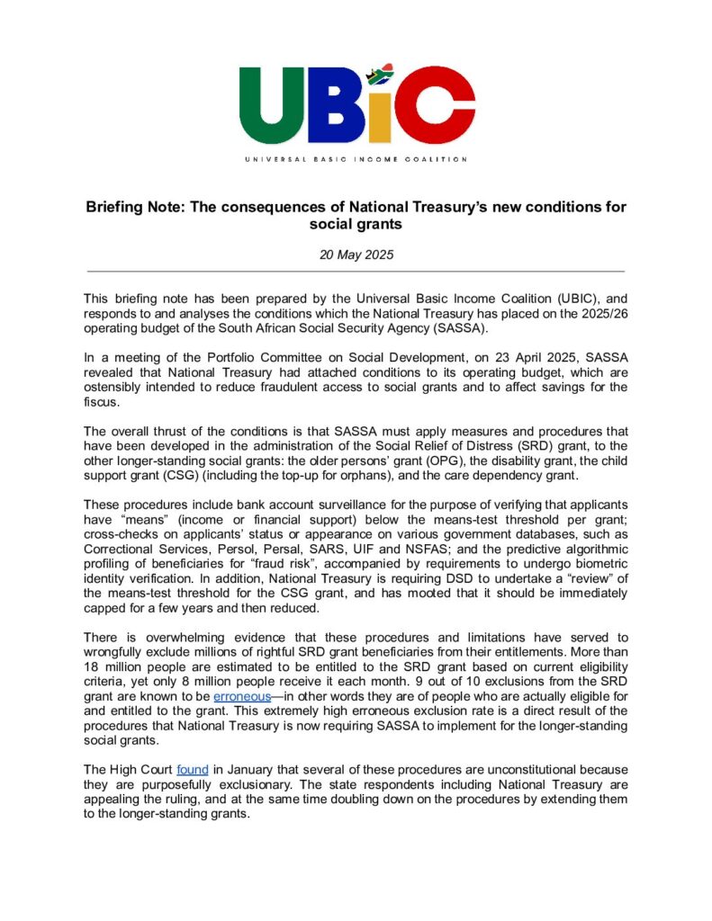 UBIC Briefing Note | The consequences of National Treasury’s new conditions for social grants