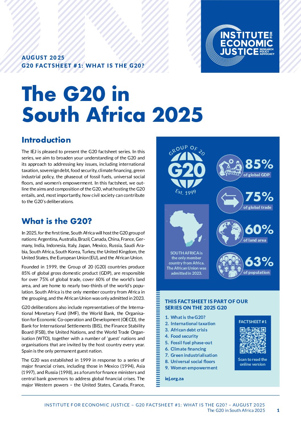 The Institute for Economic Justice (IEJ) is pleased to present the G20 fact sheet series. This series aims to broaden understanding of the G20 and its approach to addressing key issues, including international taxation, sovereign debt, food security, climate financing, green industrial policy, the phase-out of fossil fuels, universal social floors, and women’s empowerment. This fact sheet outlines the aims and composition of the G20, what hosting the G20 entails, and, importantly, how civil society can contribute to the G20’s deliberations.