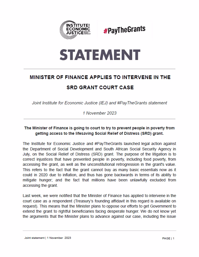 The Institute for Economic Justice and #PayTheGrants launched legal action against the Department of Social Development and South African Social Security Agency in July, on the Social Relief of Distress (SRD) grant. The purpose of the litigation is to correct injustices that have prevented people in poverty, including food poverty, from accessing the grant, as well as the unconstitutional retrogression in the grant’s value. This refers to the fact that the grant cannot buy as many basic essentials now as it could in 2020 due to inflation, and thus has gone backwards in terms of its ability to mitigate hunger; and the fact that millions have been unlawfully excluded from accessing the grant.